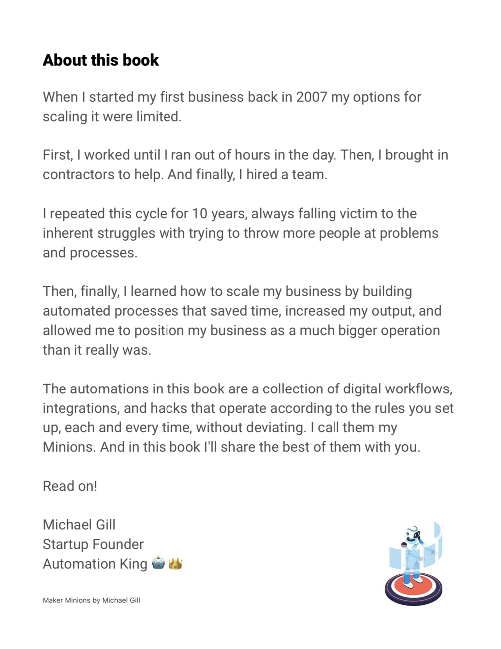 It’s like having an army of digital employees, each dedicated to a different job that you don’t even have to think about. I call them my Minions. And in this book, I'm sharing the best of them with you, along with dozens of downloadable blueprints and recipes which allow you to add these automations to your own business.
